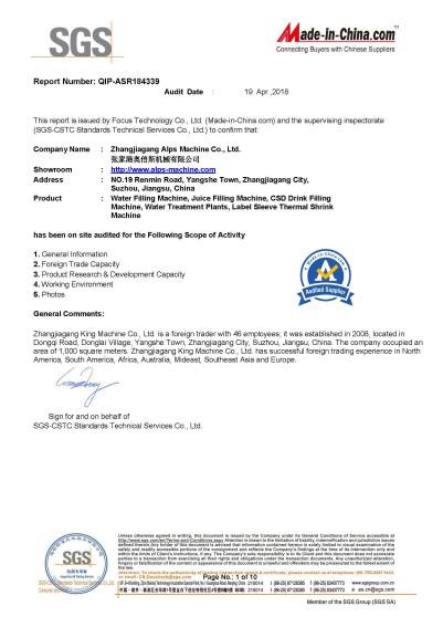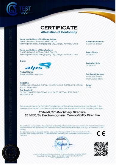 Чжанцзяган Альпские МАчине Ко., Лтд. Расположен в новом порту города Чжанцзяган, провинция Цзянсу, основан в 2009 году и профессионально занимается наливом и упаковкой напитков. Наша компания занимает площадь 20 000 м2, мы являемся ведущим предприятием в области исследований и производства упаковки жидких и напитков. Наши основные продукты включают: водоочистные сооружения, наливную машину для напитков, машину для маркировки ПВХ-рукавов, машину для маркировки горячим клеем OPP, машину для усадочной упаковки пленки, картонную упаковочную машину, производственную линию CSD, производственную линию сока, линию производства пива, линию по производству воды на 5 галлонов. Вся продукция хорошо продаётся в каждой провинции и городе страны, а также экспортируется примерно в тридцать стран и регионов.